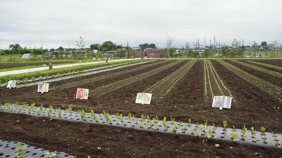 駐車場に車を停めて入り口を入ると、広い野菜畑が目に飛び込んでくる。さまざまな野菜の畝(うね)が広がり、筆者が訪れたときには幾種類かのナスなどの実がなっていた。