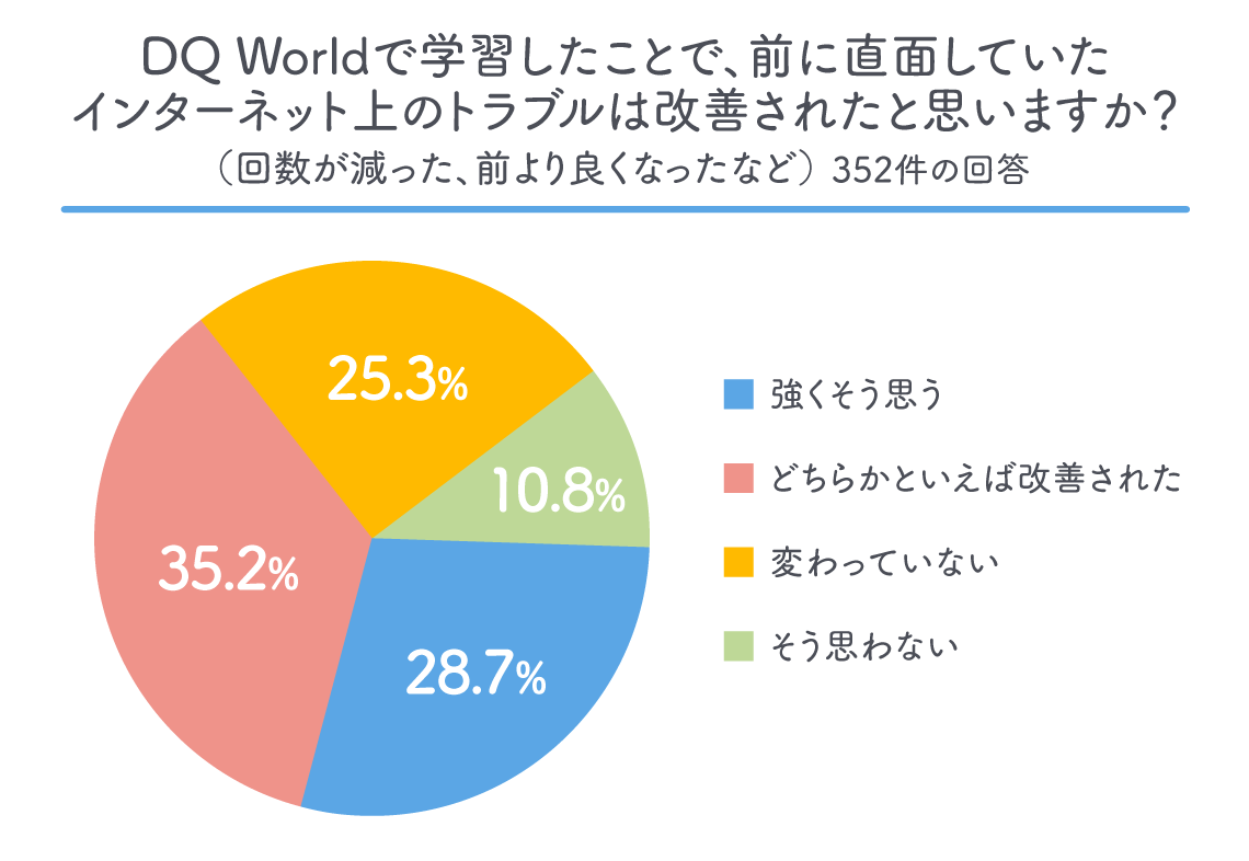 「鹿児島市では昨年、子どもに人気の『Minecraft: Education Edition』(以下マイクラ)を導入したのですが、チャット機能で子ども同士のトラブルもあったため、学校から『もっと準備してからやりたい』という声が挙がりました。そのため、いったん利用を停止し、教員向けのマイクラ研修を行ったところ、『DC教育をやってからマイクラをやらせたい』という声が挙がりました。DQ Worldも昨年度から導入したのですが、4校350人にアンケートをとったところ、最も多かったのが『傷つける言葉を使わないよう気をつけるようになった』という回答でした。64%が『改善に役立った』と答えており、DC教育を始めて3〜4ヵ月ほどで『ネットやICTのトラブルに役立った』と答えています。今年の9月からマイクラも徐々に再開しています。DQが身につくと、子どもたちはいろいろなツールを効果的に使うようになりますね」
