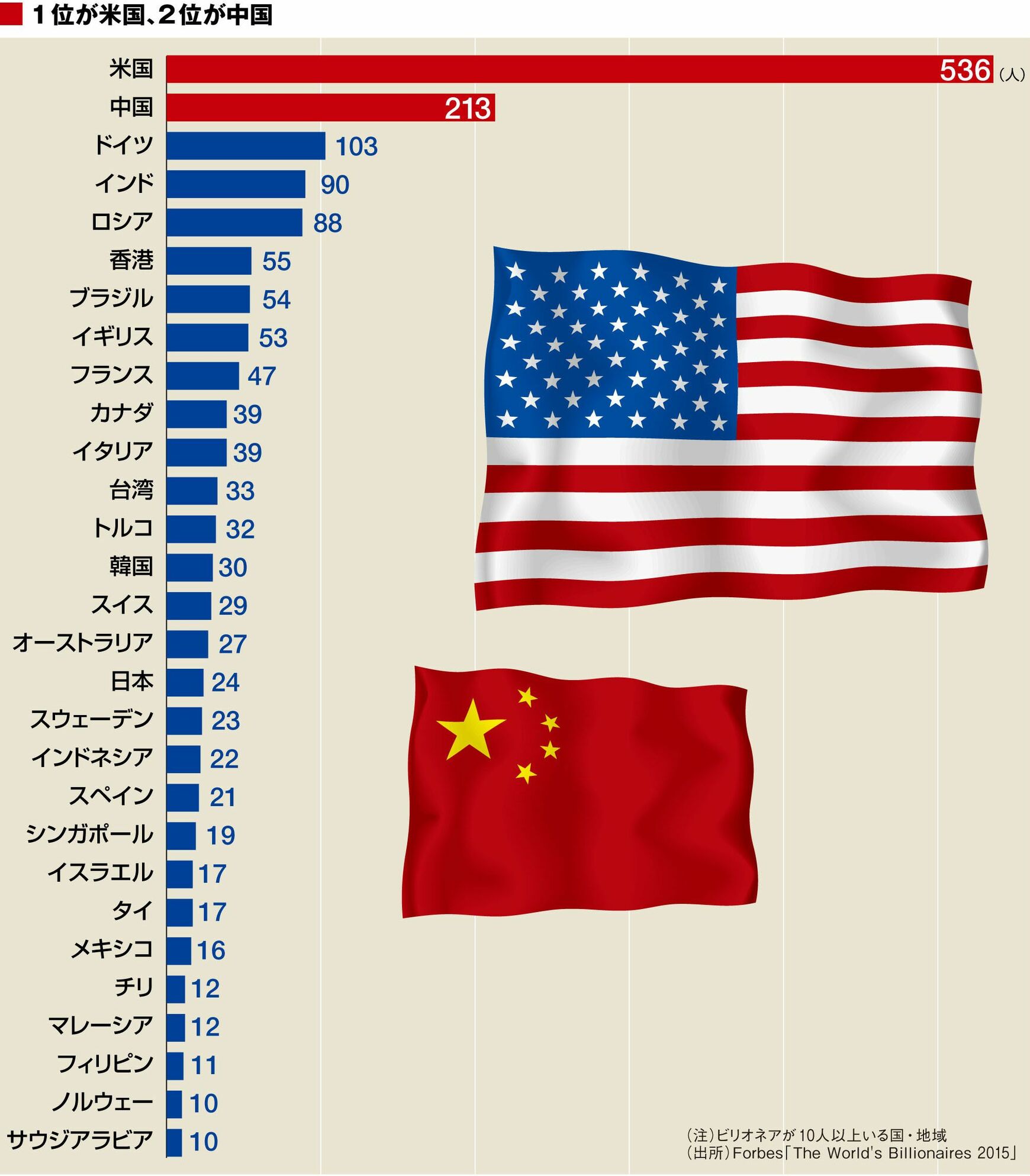 3月2日に米経済誌「フォーブス」が発表した「The World's Billionaires 2015」には日本からは24人がエントリーされている。この24人は多いのか少ないのか。全1826人を国籍でソートしてみた。分析してみた。