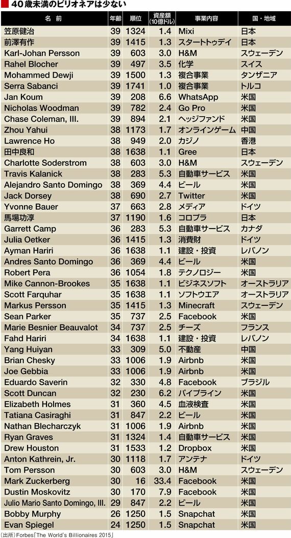 年齢でソートをしても、興味深い表ができあがる。なんと40歳未満は46人だけだ。そのうちの多くはアメリカ人。中国人は2人しかいない。その他の東アジアの国も、香港のローレンス・ホーは"2世経営者"だし、台湾、韓国には1人もいない。