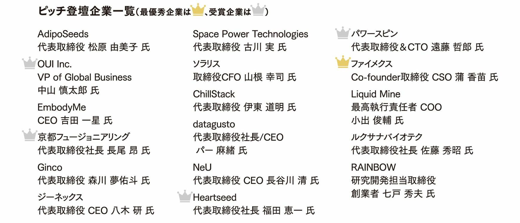 また、最先端のテクノロジーが武器の大学発ベンチャーも参戦。工学系では、従来のロボットでは入れない場所への進入を容易にする、柔らかくしなやかに動くミミズ型のソフトロボットを開発販売する中央大学発「SoLARIS(ソラリス)」や、マイクロ波によるワイヤレス給電を手がける京都大学発「Space Power Technologies(スペースパワーテクノロジーズ)」など、市場ニーズの高い企業が登壇。