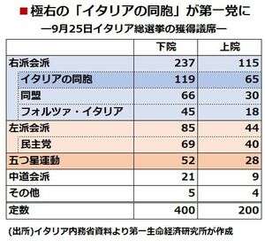 9月25日に行われたイタリアの総選挙では、事前の世論調査が示唆したとおり、主要政党では唯一、現ドラギ政権を支持しなかった極右政党「イタリアの同胞」が勝利した。