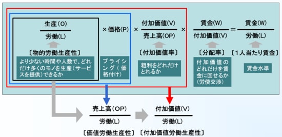 懸命に働いたときの成果として意識されることが多いのは、一番左の物的労働生産性(生産/労働)である。例えば、メーカーでどれだけ多くの製品を所定の労働時間で生産したかなどを表したものだ。しかし、物的労働生産性を改善しても、適切な値付けを行い、利幅を確保できなければ、付加価値労働生産性(赤線で囲まれた部分)や賃金は改善しない。