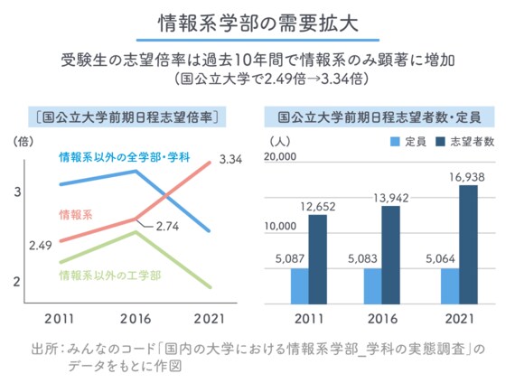 「職業選択をいつから考えるかというさじ加減は難しいのですが、ITを仕事にするということが現時点でどういう状況にあるか、保護者の認識のアップデートは必要だと感じています。先般政府はデジタル推進人材が今後230万人不足するとの予測を公表しました。IT業界だけでなく、旧来からの企業も“DX”を推進すべくテクノロジーを使いこなせる人材からの需要は高まっています。また待遇面についても、20代から他職種より高いことも魅力の1つ。その影響を受けてか、大学進学においても近年は情報系学部に人気が集まっています。また他の学部学科でも自分でコードを書いてデータ解析を行うことが求められ、2024年度の大学入学共通テストから情報科目が加わることになっています。プログラミングを学ぶことは、進路の選択肢を広げることにもつながるでしょう」