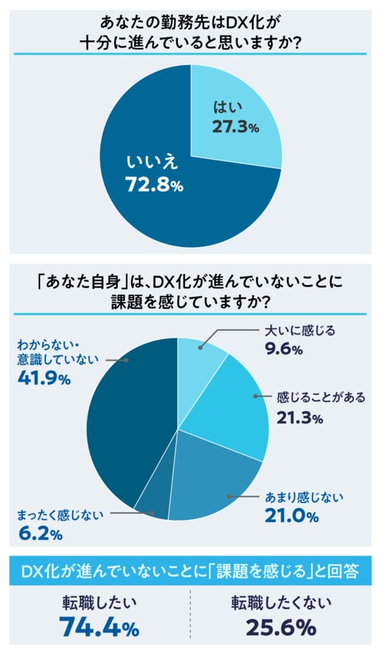 経営層と現場との間で生まれている意識のギャップ。1000名以上規模の企業に勤務する30代までの一般社員を対象とした同社の調査(※)でも、それは明確に出ている。「勤務先のDX化が進んでいない」と回答した人は実に72.8%。そのうち、進んでいないことに課題を感じている人がわずか30.9%と少ないのも衝撃的だが、その高い意識を持つ人材のうち、74.4%は「DX化が進んでいる会社に転職したい」と回答しているのだ。