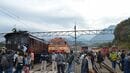 途中の「道の駅」でトイレ休憩をした後、10時28分に会津川口を通過。駅前で待機していた大勢の人たちがバスに向かって手を振ってくれた。只見に向かう途中には各所に只見線の撮影ポイントがあり、路肩や付近の駐車場にクルマを停めた撮り鉄たちが、待ち構えている。彼らもどこからか情報を入手したのか、代行バスがやってくると手を振ってくれた。