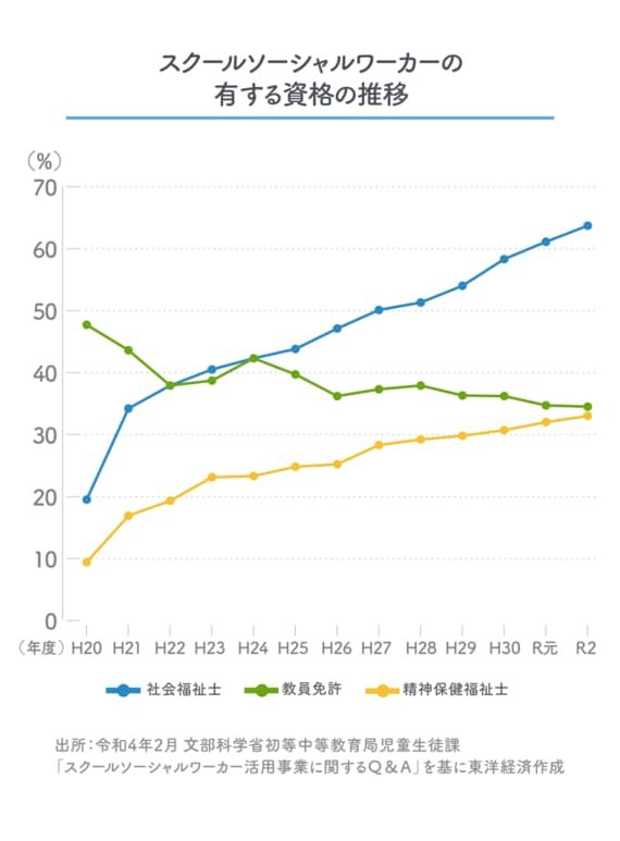 下記の推移を見ても、教員免許以外では社会福祉士か精神保健福祉士の資格を持ったスクールソーシャルワーカーがほとんどであることがわかります。