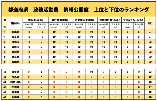 そうした観点で上の表を眺めると、ランキング下位の都道府県議会は「領収書」「会計帳簿」「活動報告書」「視察報告書」という重要書類が軒並みネット公開されていないことがわかる。