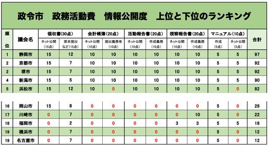 公開度が最も高い静岡市は97点で、ほぼ満点に近い。2位の京都市、3位の堺市、4位の新潟市も90点以上という高評価だった。