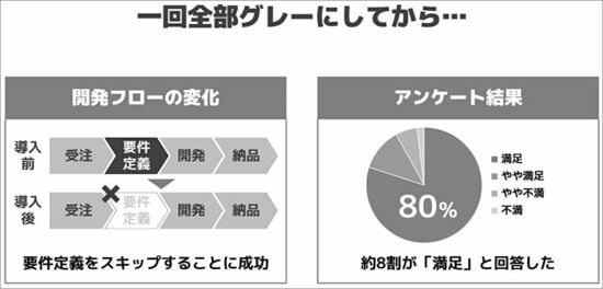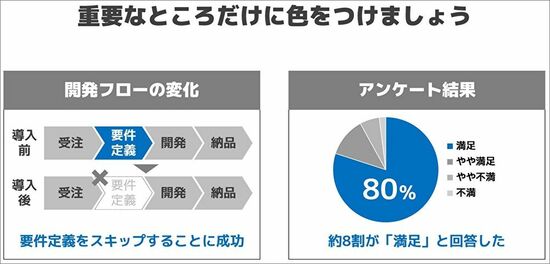 スライドを作る時は必ず最初に思い切って「グレーの世界」に飛び込みましょう。グレーの世界はいささか寂しいですが、本質を見定めるには絶好の舞台です。すべてをグレーの濃淡で示した後、重要な部分だけに絞って色を付けることで、見るべきポイントがわかりやすいスライドを作ることができるのです。