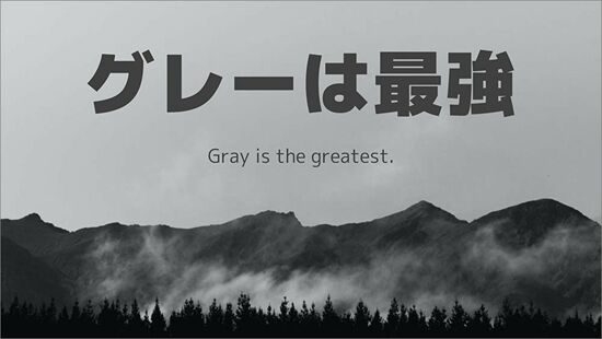「Gray is the greatest.」――これは私がいつも口を酸っぱくしてお伝えしている格言です。青を使うか赤を使うかに迷っている時間があったら、とりあえず最強の色「グレー」を使ってみましょう。グレーは、あらゆるスライドで活躍する最強の武器だからです。