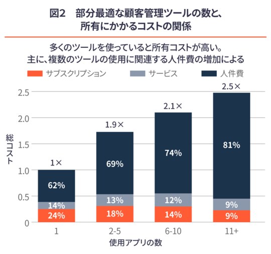 これは想定の範囲だろう。企業はこの数年で、顧客接点強化や業務効率化を狙って次々とデジタルツールを導入してきた。ツールが増えれば、その導入費用はもちろん、運用などに関連する人件費が膨らむ。実際、この調査で使用ツール数と総コストの関係を分析したところ、使うツールの数が多いほど、ツール活用のための人件費増加によってコストが増えていた(図2)。