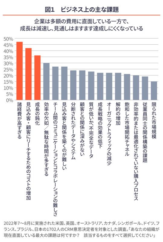 HubSpotは2022年7~8月、米国や日本、英国、ドイツ、シンガポールなどの9カ国で、CRM意思決定者1702人を対象に調査を実施。「あなたの組織が現在直面している最大の課題は何か」と質問したところ、最多回答は「費用が高すぎる」、次いで「見込み客・顧客にリーチするためのコストの増加」だった(図1)。