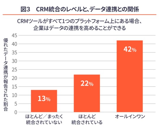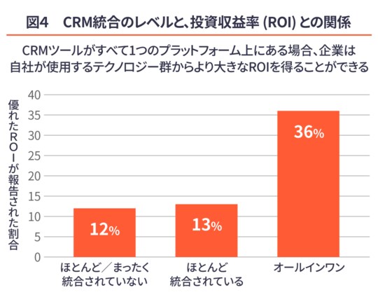 今回の調査でも、CRMの統合レベルが高いほど、データの接続性が高まり(図3)、さらにROI(投資利益率)が上がることが明らかになった(図4)。HubSpotのCRMプラットフォームは、この3つの領域につながりを持たせるよう意識して開発されており、連携性や統合性に特長がある。