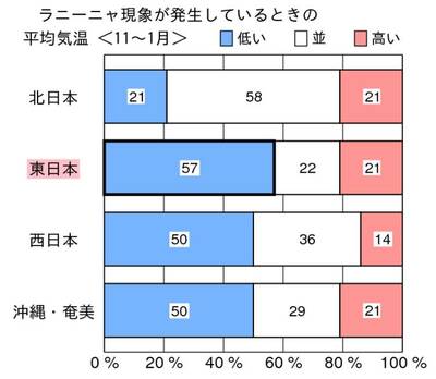 しかし一転、ラニーニャ現象が発生しているときの11月〜1月の平均気温は東日本で低い傾向、西日本と沖縄・奄美は低い割合が50%です。