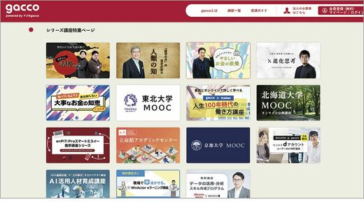 gacco(ガッコ)は日本最大のMOOCプラットフォーム。JMOOCに参画し、大学などと制作した講座を公開する。それ以外にも、グーグルが提供するデジタルスキルトレーニングなど、さまざまなMOOC講座をgaccoプラットフォームで配信している。基本的に受講は無料だが、さらに学びたい人向けに有料講座もある。随時新講座が始まるので、開講情報に目を通しておきたい。