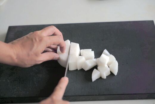 大根は厚めに皮を剥き2cm角くらいに、にんじんは乱切りにします。