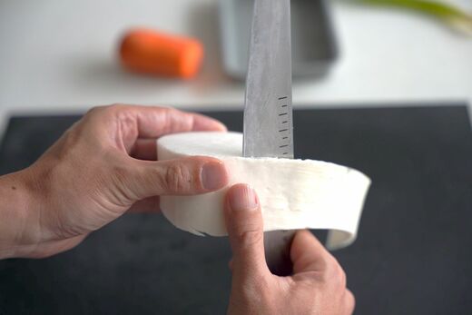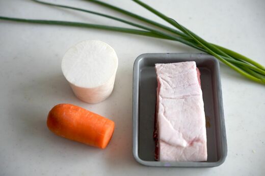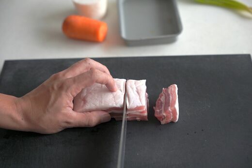 豚バラ肉は2.5cmくらいの厚みに切ります。5cm×2.5cm×2.5cmくらいの大きさになるはずです。鮮度の悪い豚バラ肉を使う場合は下ゆでして、臭みを抜く必要がありますが、スーパーで買ってきたばかりであればその手間は不要です。