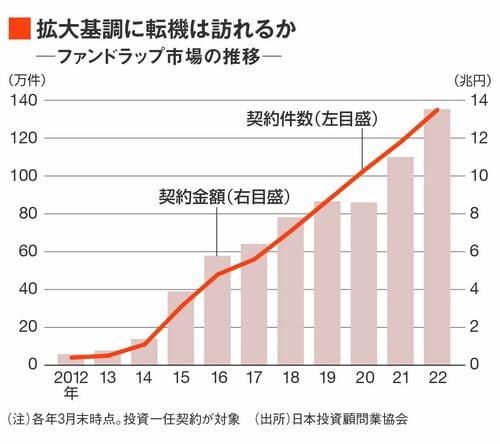 元々は富裕層向けサービスだったが、取り扱い金融機関の増加やマス層への普及によって、契約件数と金額はともに右肩上がりだ。10年前に6000億円に満たなかった市場規模は、今や13兆円を超えるまで膨らんだ。