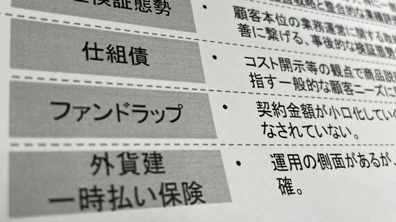このうち仕組み債と外貨建て一時保険は、元本毀損リスクや販売手数料の高さを金融庁がかねて問題視しており、すでに金融機関へのヒアリングに乗り出している。