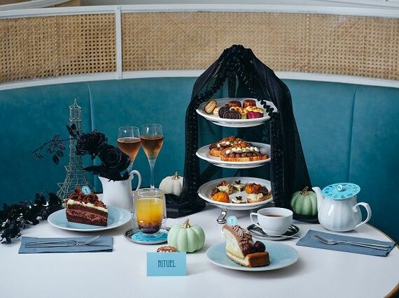 「RITUEL CAFE(リチュエル カフェ)」の「ホーンテッドアフタヌーンティー」ではティースタンドに魔女のドレープをまとわせた不気味な雰囲気を演出。