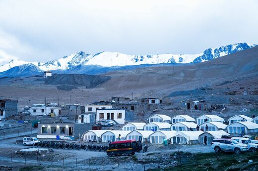 ツォ・モリリ湖近くのキャンプ場の背後の山々は8月でも雪に覆われていた(撮影:河野正士)