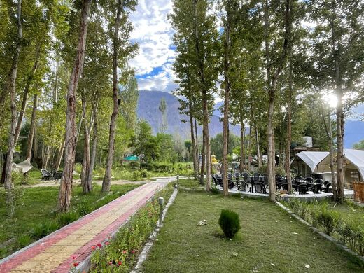ヌブラ渓谷のキャンプ場は花が咲きハンモックが揺れる楽園(筆者撮影)
