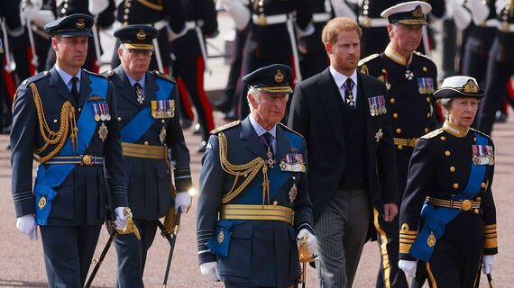 と同時に、軍隊色の濃い儀式でもあった。女王のひつぎを砲車に載せ、ウェストミンスター寺院まで牽引したのは、若い海軍兵士たち。その後を行進した新国王のチャールズ3世、娘のアン王女、皇太子となったウィリアム王子はいずれも軍服の正装だった。
