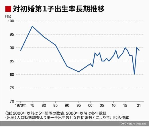 第1子出生数を女性の初婚数で除した「対初婚第1子出生率」でみれば、第2次ベビーブーム期のほぼ100%に近い状況には及びませんが、1990年代に比べれば、2021年実績でも89%とほぼ9割の初婚女性が第1子を出産していることになります。