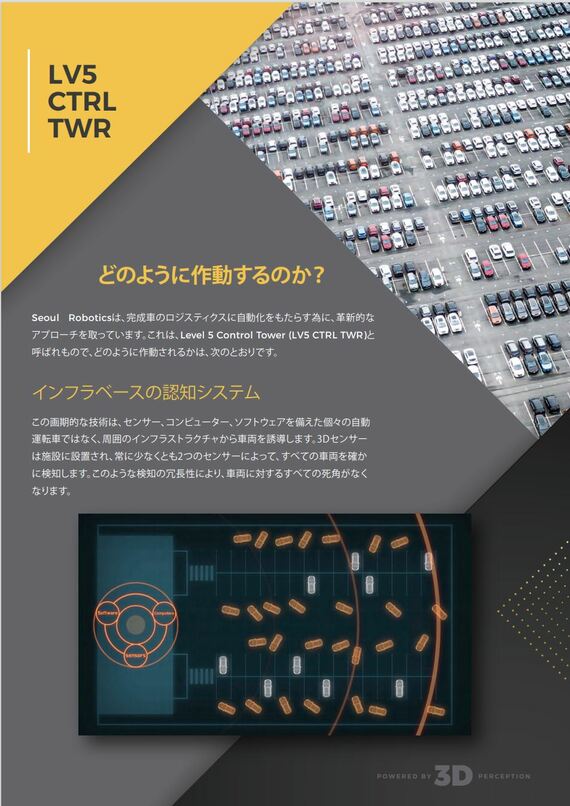 韓国のスタートアップ企業「ソウルロボティクス」が開発した認知プラットフォーム「SENSR(センサー)」を活用するこのシステムは、生産されたばかりの完成車を保管倉庫などへ自動搬送するためのものだ。搬送できるクルマは、近年、コネクティッドサービスなどで採用例が増えてきた車載通信機など、現在では一般的になっている装備さえあれば、自動運転向けの特別な装置がなくても対応する。