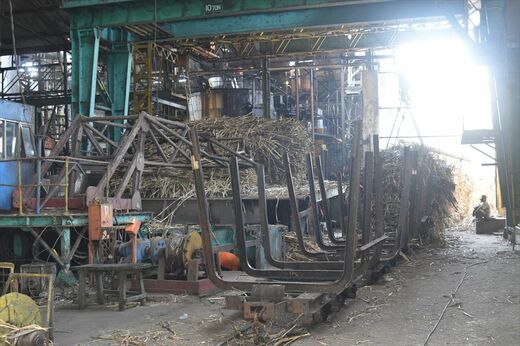 工場内では蒸気機関で動く巨大な歯車がいくつも回っており、ここにも100年以上前と変わらない風景が広がっている。トラックからローリーに積み替えられて工場内に搬入されたサトウキビは再びクレーンで引き上げられた後、この歯車で動かしているベルトコンベア上を流れて、圧搾~洗浄~濃縮などの工程を経て、最終的に砂糖として出荷される。