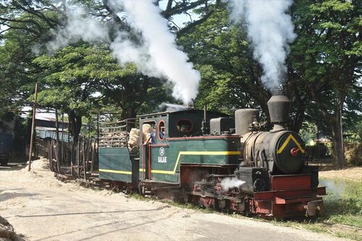 近隣のPGの様子も見てみよう。まず向かった先は、シュガートレインが公道を横切る踏切のあるPGパゴタン。行ってみると、さっそくローリーがディーゼル機関車に押し込まれて通過していった。さらに、工場のほうには3両のSLの姿が見える。これも復活したのかと思えば、作業員曰く毎年走っているという。