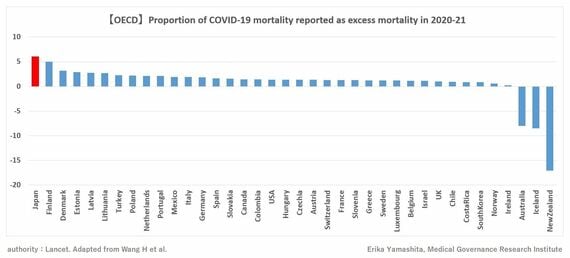 きっかけは、3月10日に、アメリカ・ワシントン大学の研究チームが、イギリス『ランセット』に74カ国と地域を対象に、2020年1月から2021年12月までの超過死亡を推定した論文を発表したことだ。この研究で、日本の超過死亡数は11万1000人と推定され、確認されたコロナによる死者1万8400人の6.0倍だった。この数字は、経済協力開発機構(OECD)加盟38カ国中で最大だった(図1)。つまり、日本の超過死亡の多さは、2021年末の段階ですでに問題だったのだ。