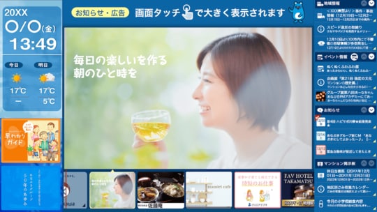 「当社は、そのマンション自体を『地域の情報を集めて掲示できる場所』へと変えることで、地域への貢献やマンションの資産価値向上をご提案させていただくこともあるんです。実際、近隣のお店の広告や地域の情報を提供するデジタルサイネージをマンションの共有部分に導入する提案も行っています」(大森氏)