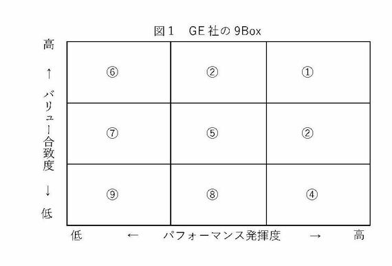 そうすると、先に評価したパフォーマンス発揮度の評価とバリュー合致度の評価がともに最高レベルなので、9Boxの最も右上にこの従業員の名前が書かれることになる(図1の①)。