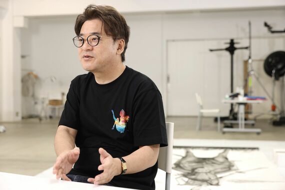 『キングダム』作者の原泰久氏。後ろにあるのは「キングダム展」に向けて制作した巨大な墨絵(撮影:尾形文繁)