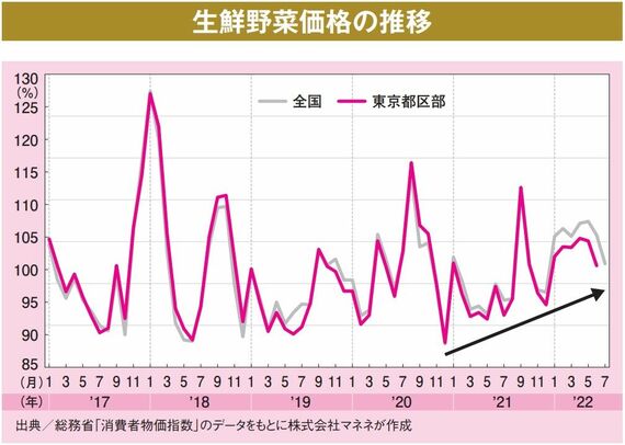 しかし、その野菜の値段も他のモノと同様に上昇しています。総務省が発表している消費者物価指数のデータから、全国と東京都区部における生鮮野菜価格の推移を見てみましょう。生鮮野菜は天候の影響を受けやすいため、価格変動が大きいのですが、2020年後半からは明確に野菜価格が上昇傾向にあることがわかります。