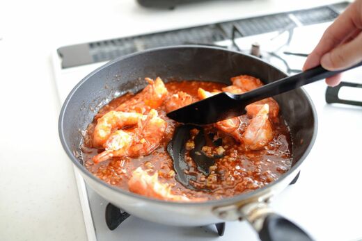 さきほど焼いたエビを加えて、30秒ほど煮込みます。チリソース煮とは言っても日本の煮物とは違い、長時間煮るわけではありません。食材にあらかじめ火を通しておき、合わせてなじませる手法です。