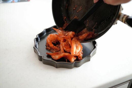 火を弱火に落とし、水溶き片栗粉でとろみをつけていきます。片手で水溶き片栗粉を少しずつ注ぎ、もう片方の手で絶えず混ぜるようにすると玉になりません。フライパンのなかに1カ所、水分の多い場所をつくり、そこでとろみをつけてから全体に馴染ませるようにするのがコツです。