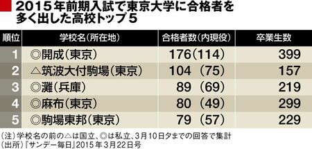 3月12日発売の『サンデー毎日』2015年3月22日号(毎日新聞社)によれば、東大合格者をたくさん出した高校トップ5の顔ぶれはおなじみの面々だ。