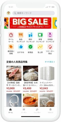 取扱商品は食品、日用品、家電、化粧品など。通常より10~20%オフの商品が大半だが、カウシェでは成立までの必要人数が30人、50人といった「大人数シェア買い」というイベント企画も行っており、その場合40~60%値引きされることもある。また過去には2000人の大人数シェア買いが成立したこともあるそうだ。四半期に1回程度開催される「超シェア買い祭」ではそれ以上の低価格化が可能で、過去の例では約5000商品が最大79%オフになったことも。
