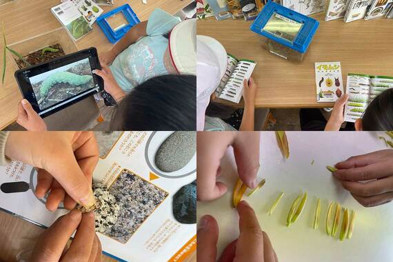 例えば北小の学校図書館では子どもたちが日々、通学路で拾った実や生きたトカゲなど調べたいものを持ち込み、みんなでにぎやかに同定していく。