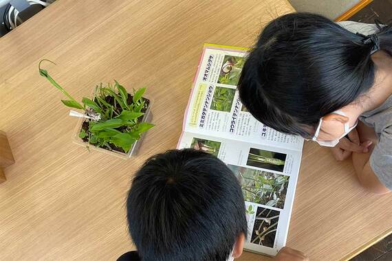 ある3年生(当時)の児童は、庭の植物の葉を持ち込み、植物図鑑であっという間に「カラスビシャク」と同定。さらに、翌日には「茎にできる球芽(ムカゴ)や仏炎苞(ぶつえんほう)という葉の中にある粒状のめしべが、図鑑の記載のとおり本当にあるのか確かめたい」と、カラスビシャクを株ごと持ってきた。