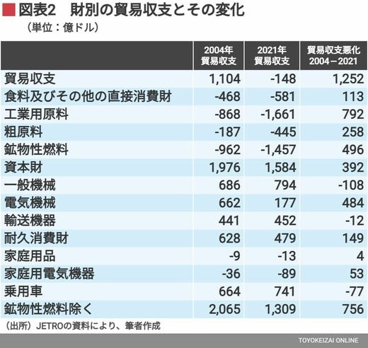 図表2は、2004年と2021年の輸出・輸入差額を、財別に示したものだ(いくつかの財を省略して示してある)。