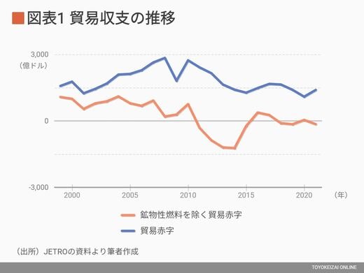 (注:これは、貿易統計ベースの数字だ。国際収支統計では、2021年の貿易収支は黒字になっている)
