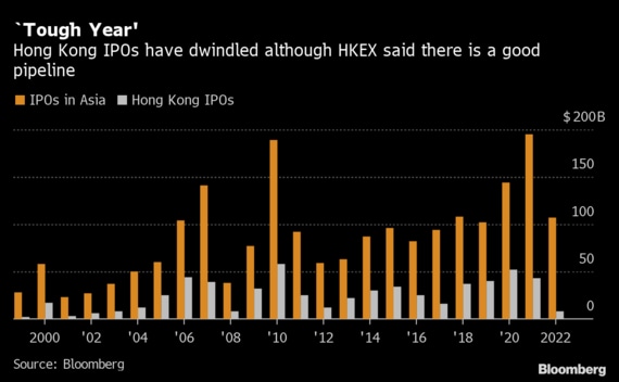 地域の新規株式公開(IPO)に占める香港のシェアは約20年ぶりの低水準付近で推移。世界的にIPOが低迷する中で、中国のゼロコロナ政策や不動産不況が株式相場の重しになっている。年初来の発行ベースでは、香港は日本を除くアジアで5位と、昨年から1つ順位を落とした。