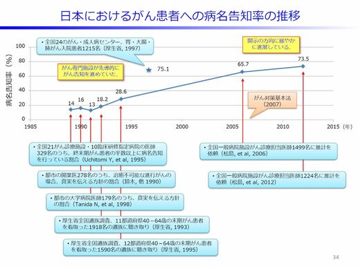 そこで厚生労働省のサイトを探ったところ、それまで研究者や一部地域で散発的に調査されてきた告知率調査をまとめた資料が見つかった。岡山大学大学院の藤原俊義教授が「第42回がん対策推進協議会」のために2014年2月に作成したものだ。