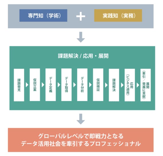 技術革新につながるデータサイエンティストのニーズは非常に高まっていますが、一方で学びの場が少なく、必要とされる知識・スキルを持った人材が非常に少ないのは大きな課題です。またデータ社会創成期の現状では、データが社会をどう変えるのか、先々を見通す力も必要となります。実践力と知識、2つの軸となる力を身に付けた人材を輩出することが、当プログラムの大きな目的となっています。