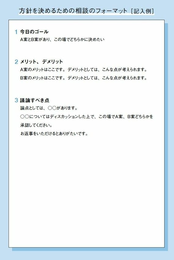 とはいえ、承認を得るために議論をしなくてはいけない場合もあります。でも、上司から目的と関係のないツッコミをされて、肝心の議論が時間切れになってしまうことってありますよね。そんなときは、以下のようなフォーマットに、「これだけ」をまとめた資料を作ります。