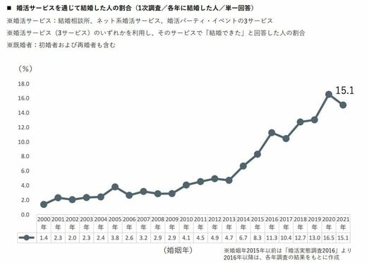 この結果をもとに、婚活サービスのいずれかで出会い、結婚した人の割合を見ていく。2021年の婚姻者のうち、15.1%が婚活サービスを通じて結婚している。かつ、2013年以降、長期的に見て増加傾向にあるのだ。